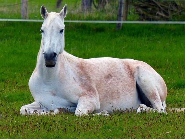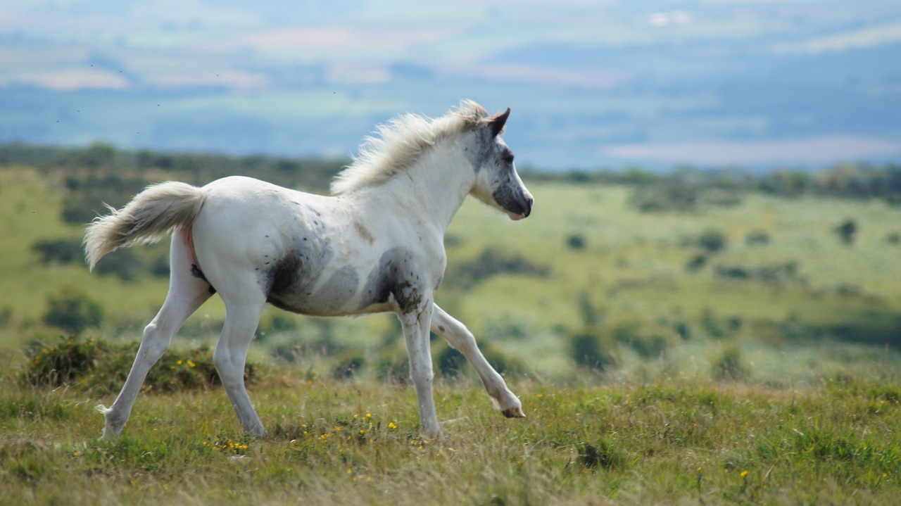 Bílý kůň s malinkými černými nebo hnědými tečkami.