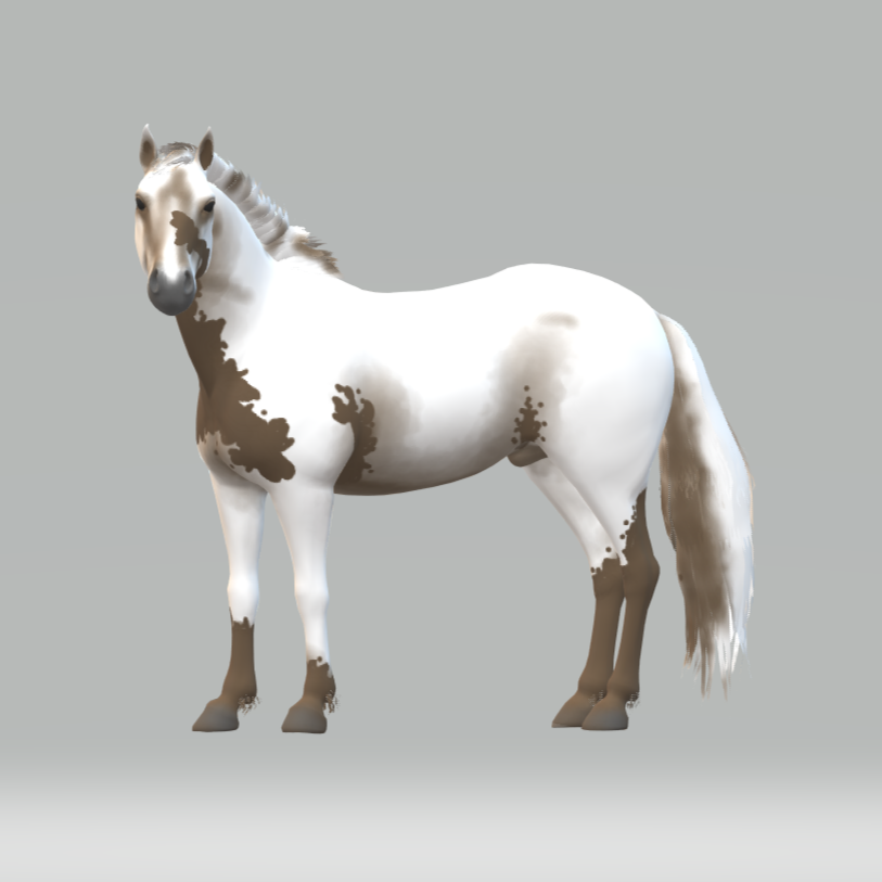 Koně na obrázcích jsou zbarvení do druhu strakoše frame overo. Jsou to koně z velkou bílou plochou na bocích a pár malými fleky okolo nebo vevnitř. Vypadají trochu jako kdyby na každé straně měli nepravidelný rám. ↓